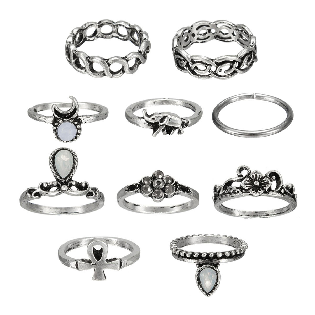 10 Peças Vintage Anéis de Falange de Desenho Tribal e Étnico Kit Anéis de Hippie Joint Punk para Mulheres COD