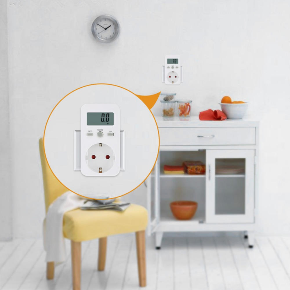 - 3 botões para operar, fácil e conveniente de usar. Limpeza de dados: pressione e mantenha pressionado o botão "MODE" por 5s e depois limpará os dados de KWH, PRICE e COST / KWH. Pode definir o preço da eletricidade pressionando o botão "SET".