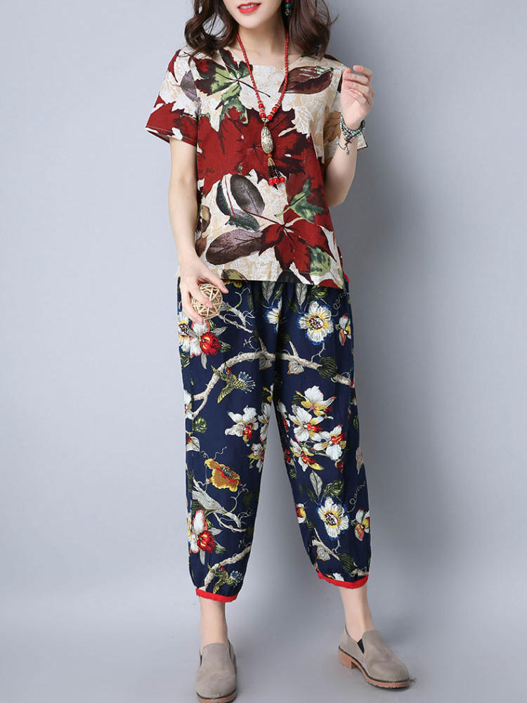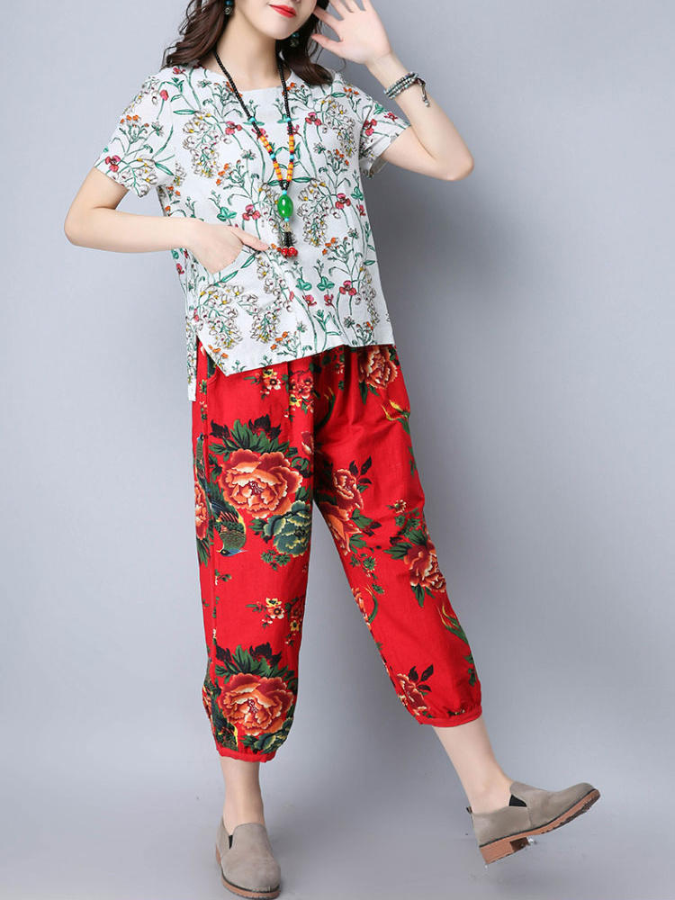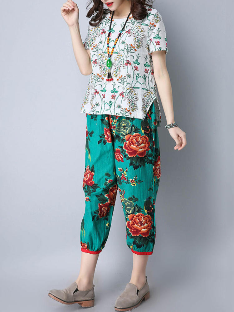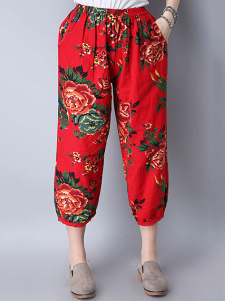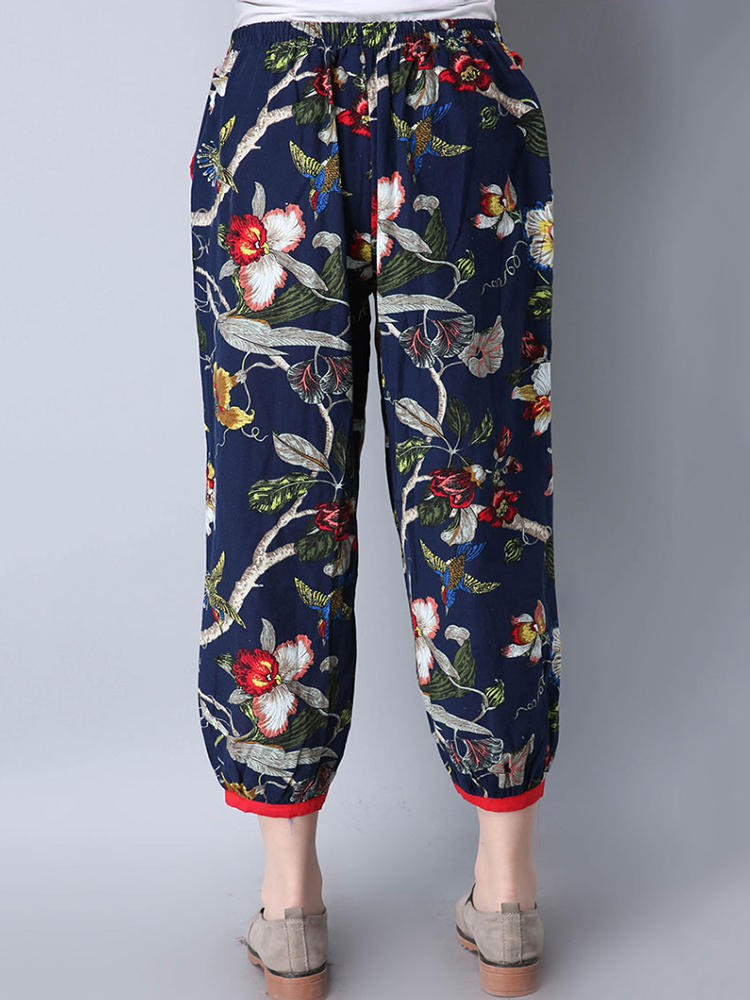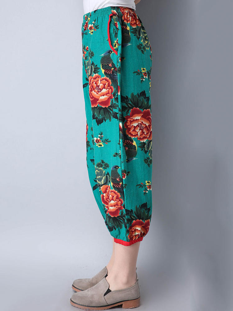 • Mulheres étnicas, cintura elástica, floral, colheita impressa Calças