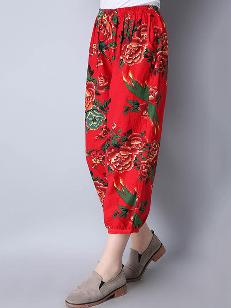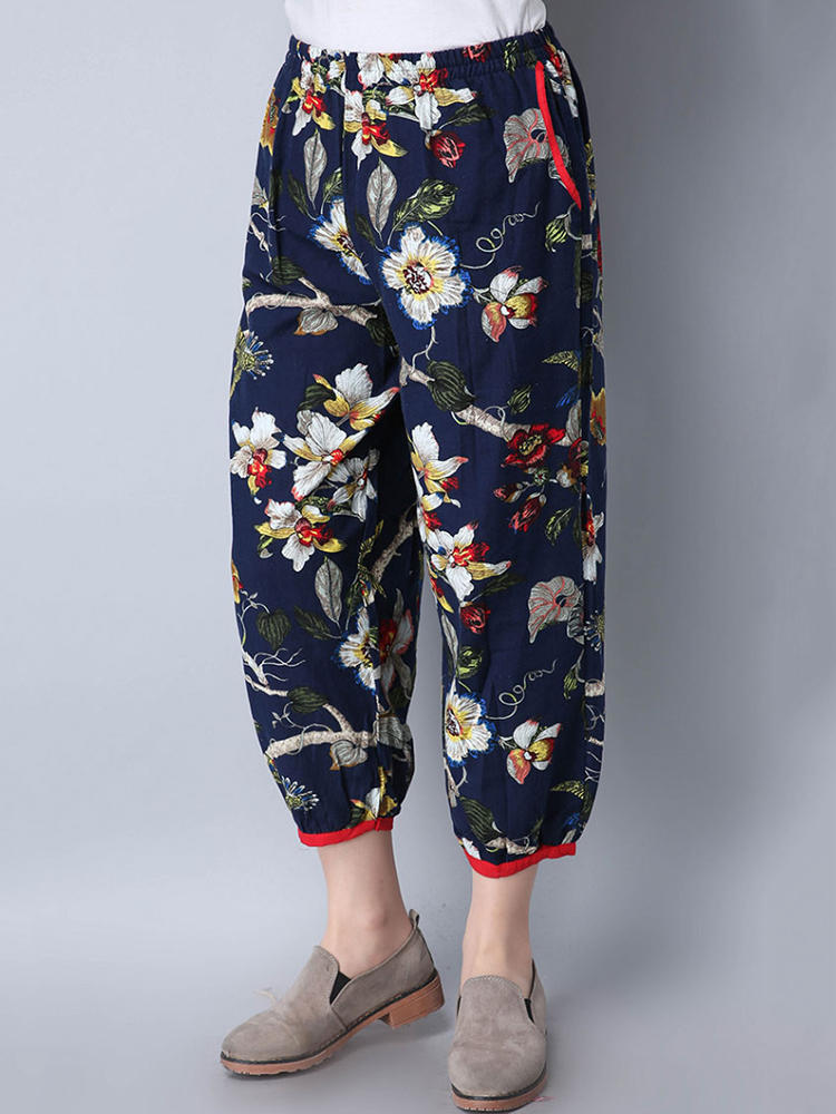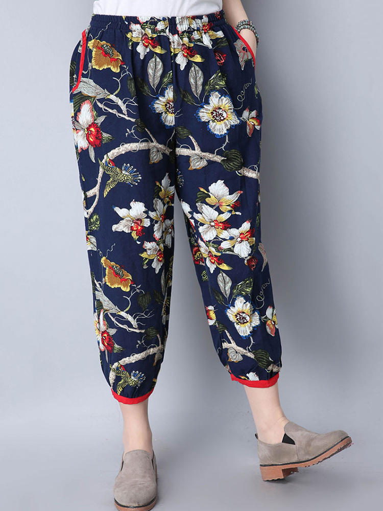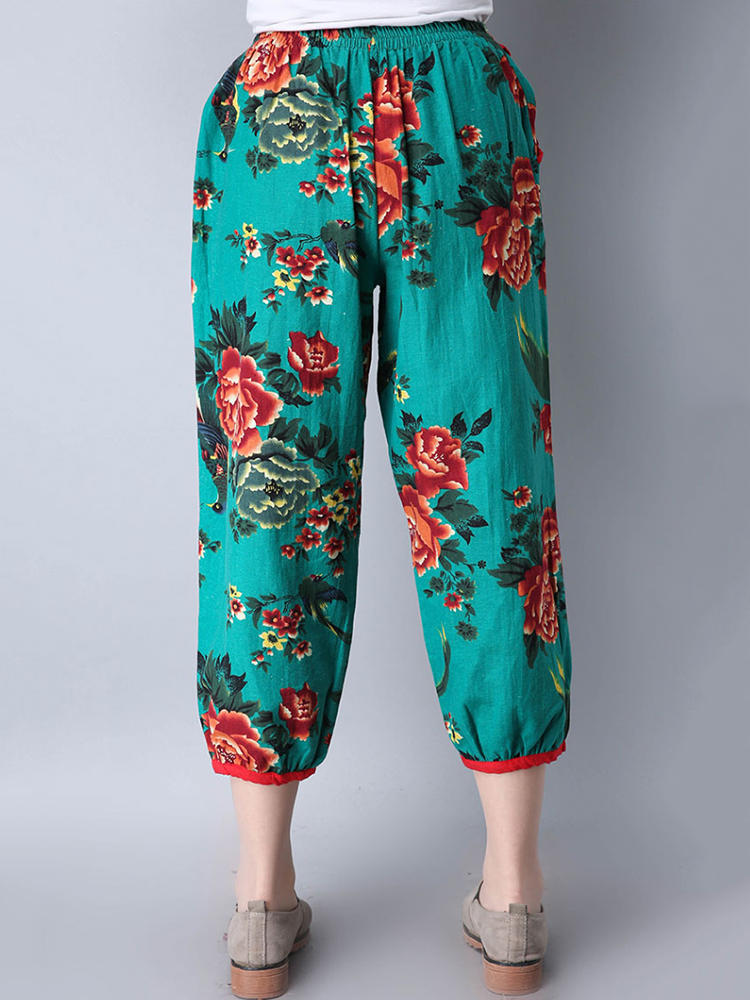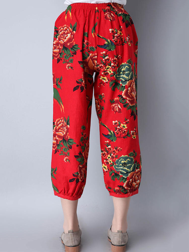 Mulheres étnicas, cintura elástica, floral, colheita impressa Calças