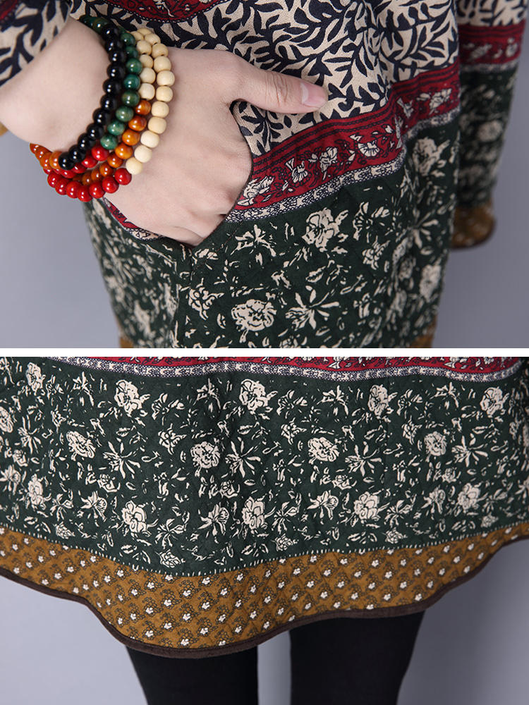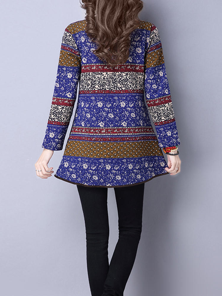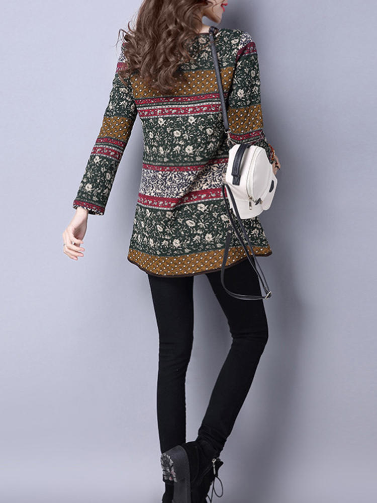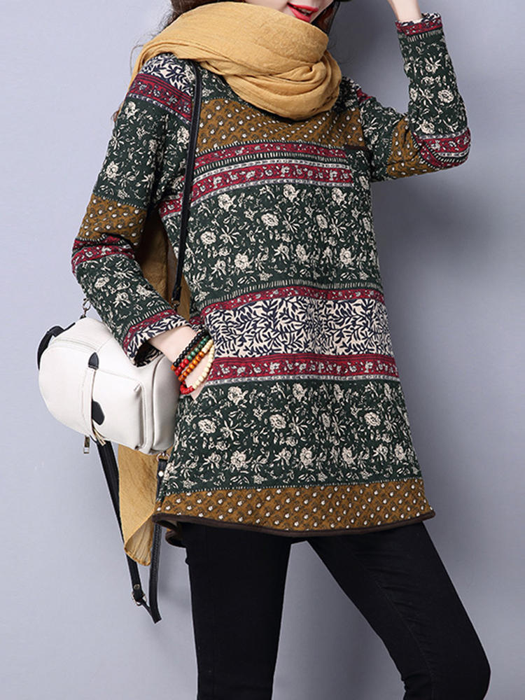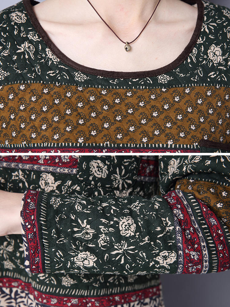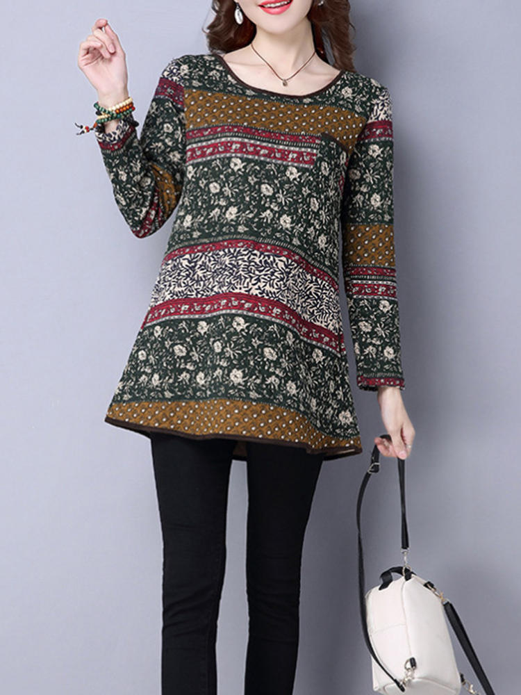 • Folk Style Mulheres manga comprida Floral Printed Pullover T-shirt com bolsos