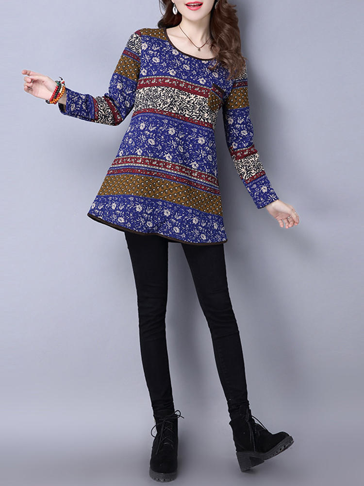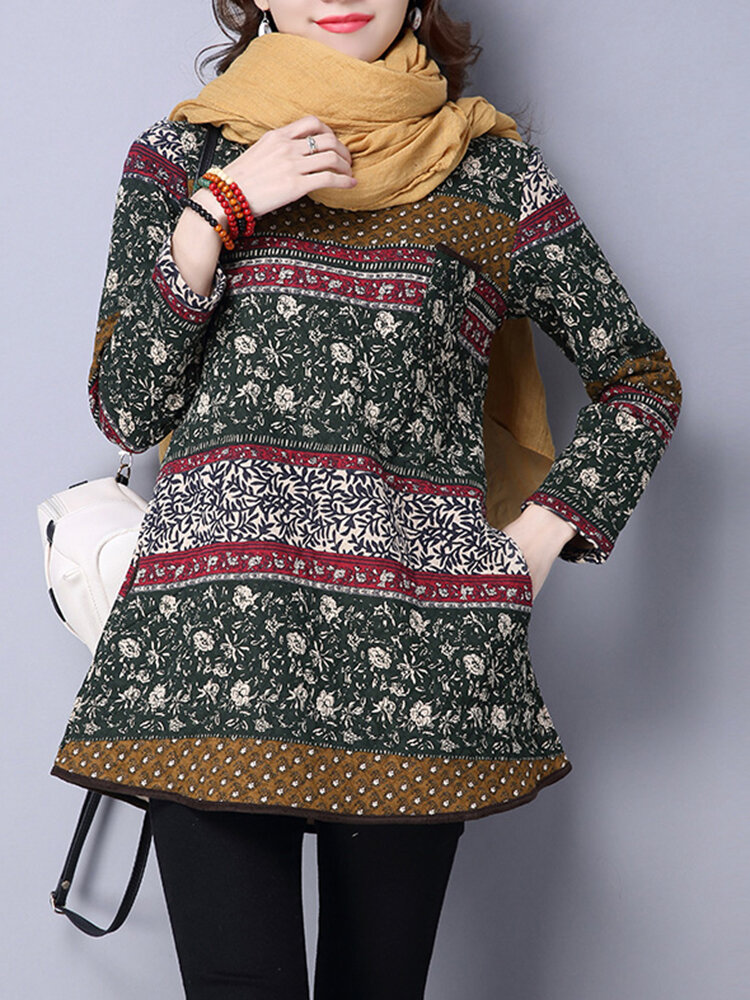 Folk Style Mulheres manga comprida Floral Printed Pullover T-shirt com bolsos