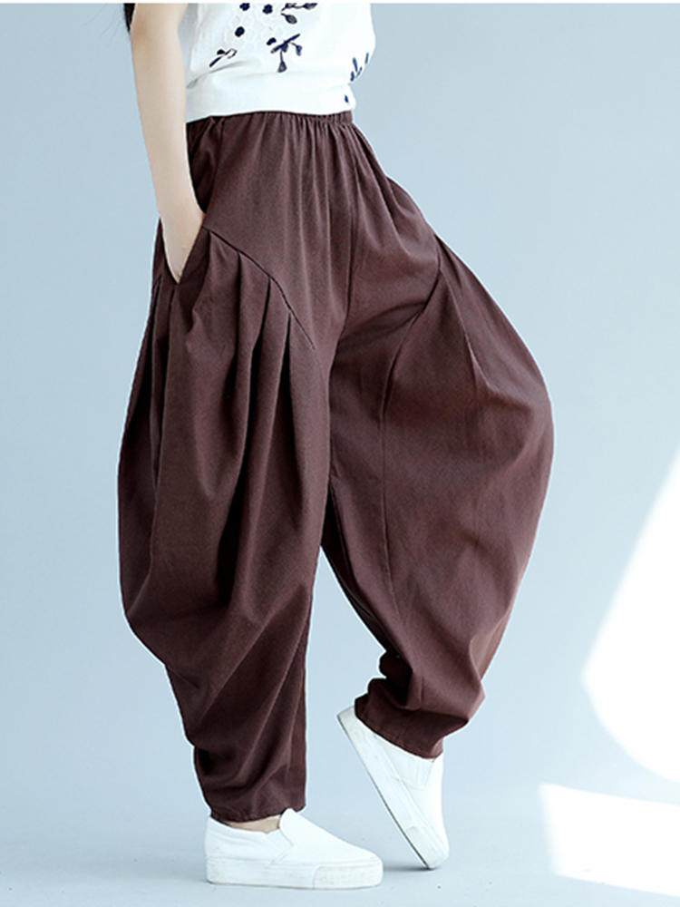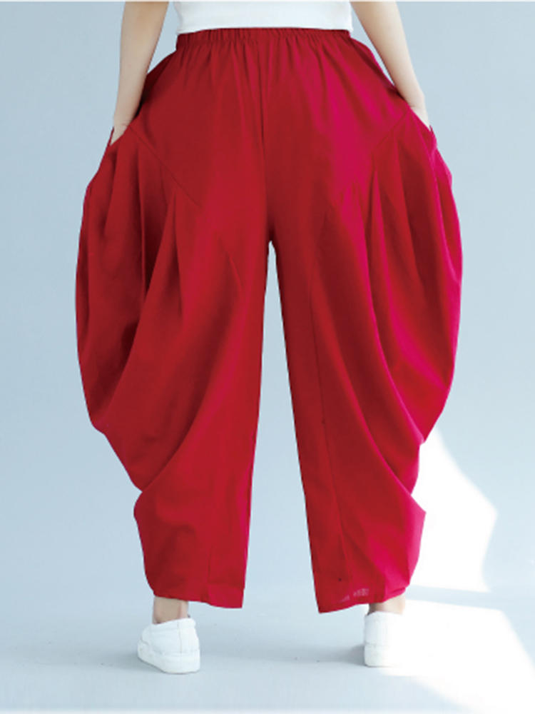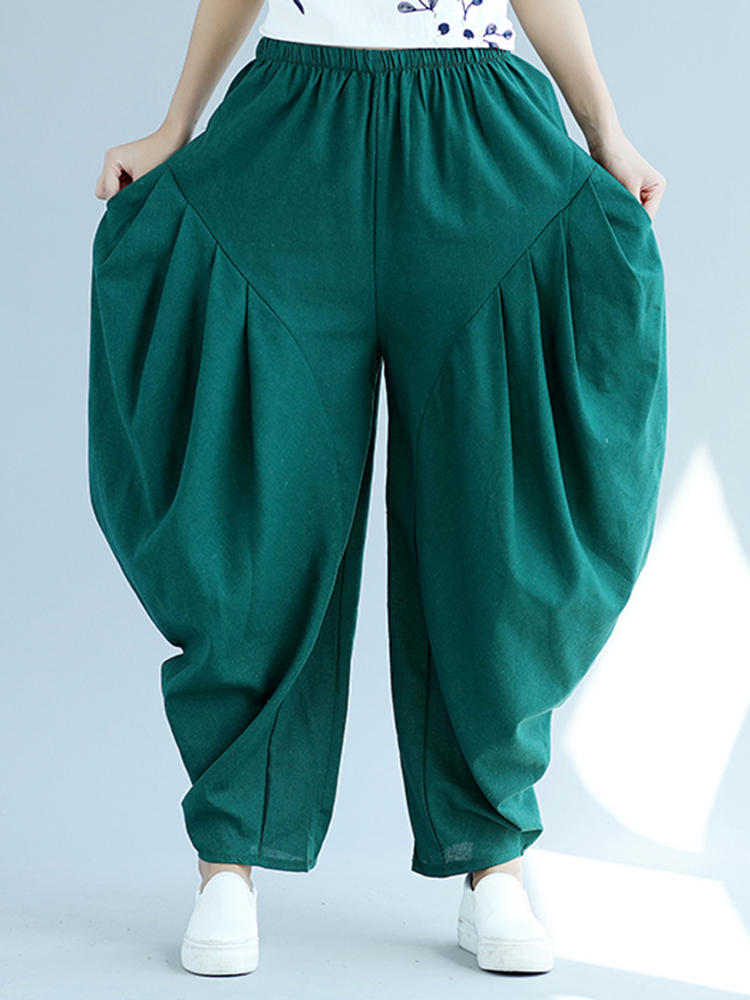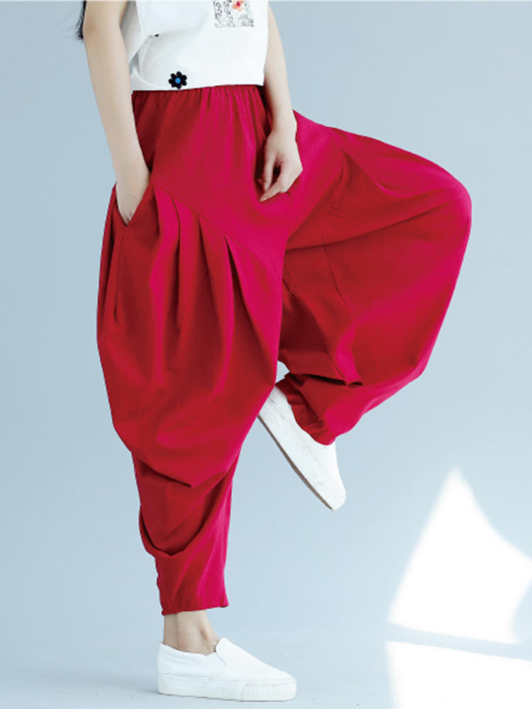 • Folk Style Women Pure Color Elastic Waist Irregular Baggy Harem Calças