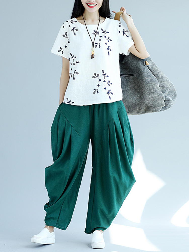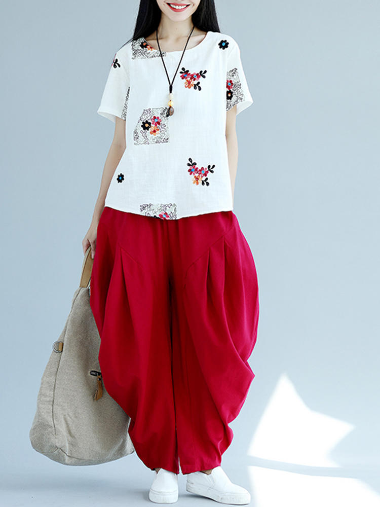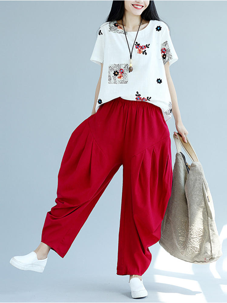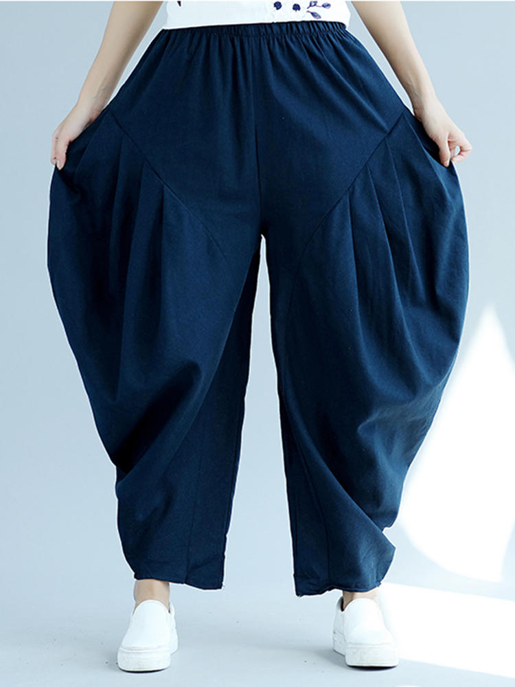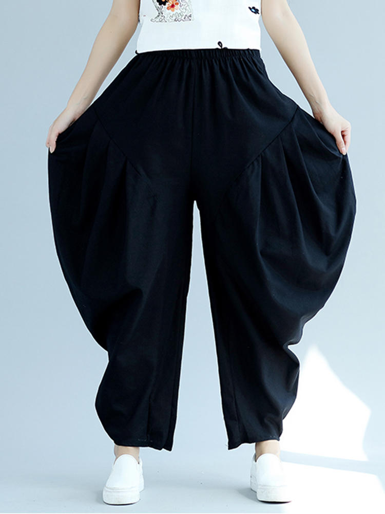 • Folk Style Women Pure Color Elastic Waist Irregular Baggy Harem Calças