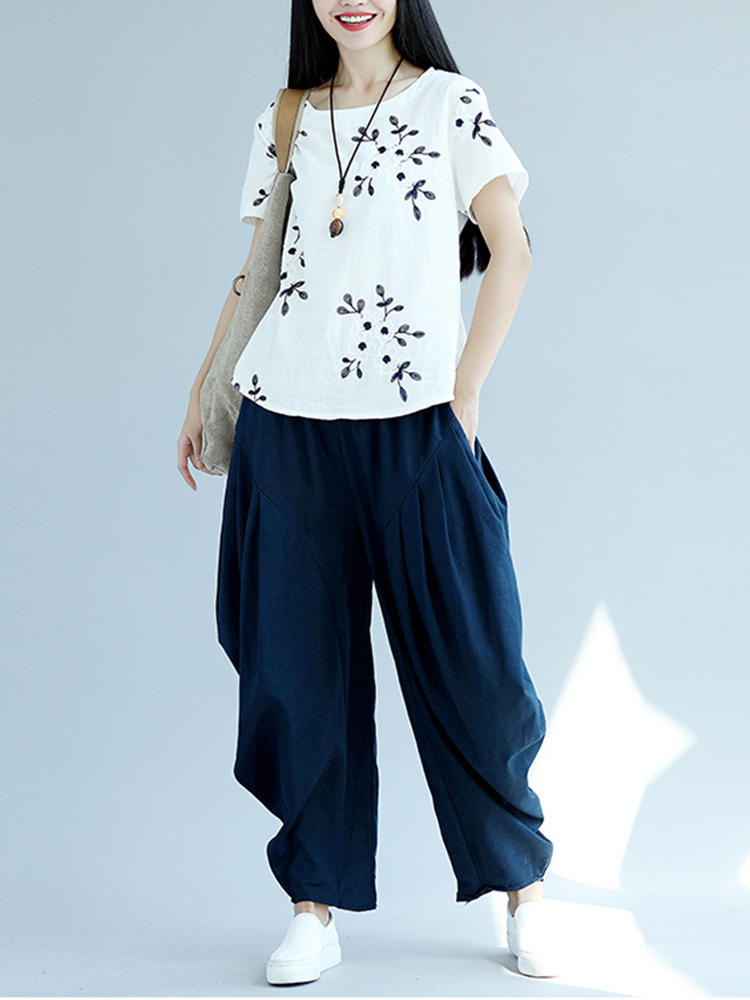 Folk Style Women Pure Color Elastic Waist Irregular Baggy Harem Calças