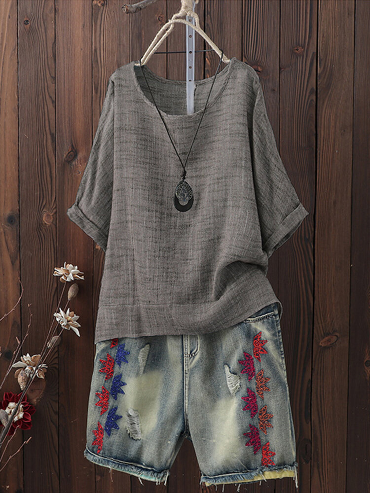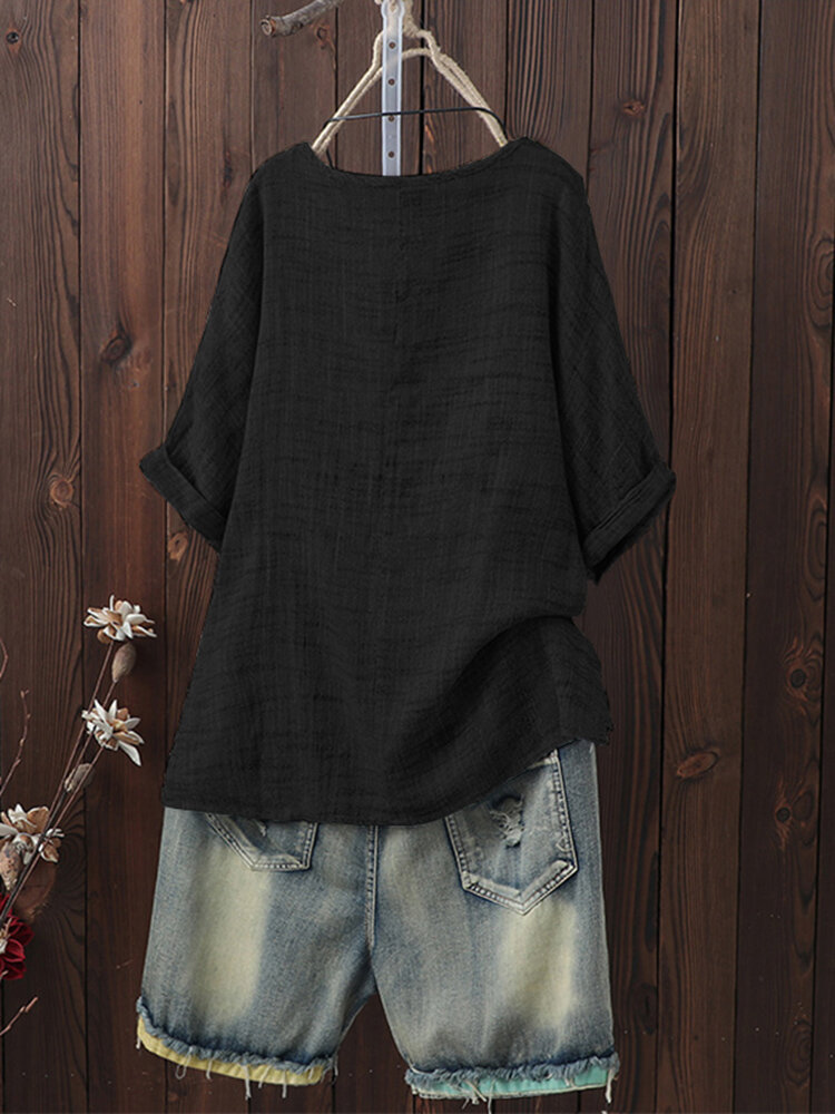 • Plus Tamanho Vintage em torno do pescoço manga 3/4 Blusa Mulheres