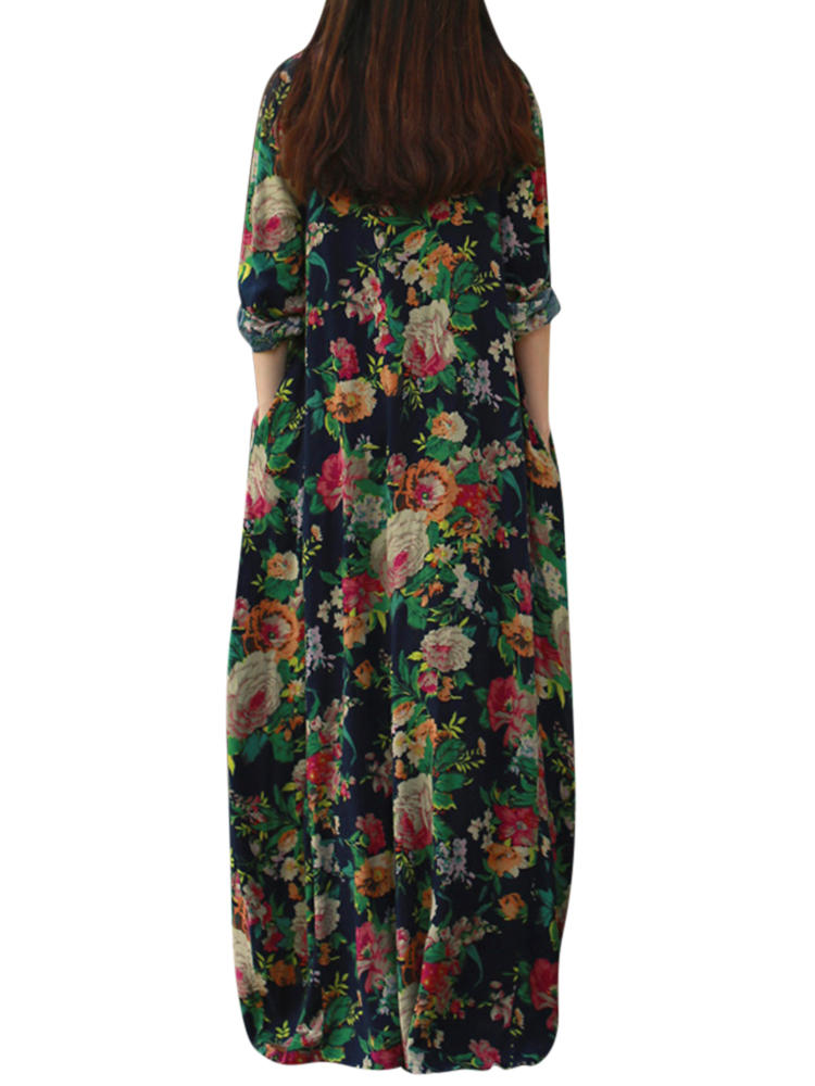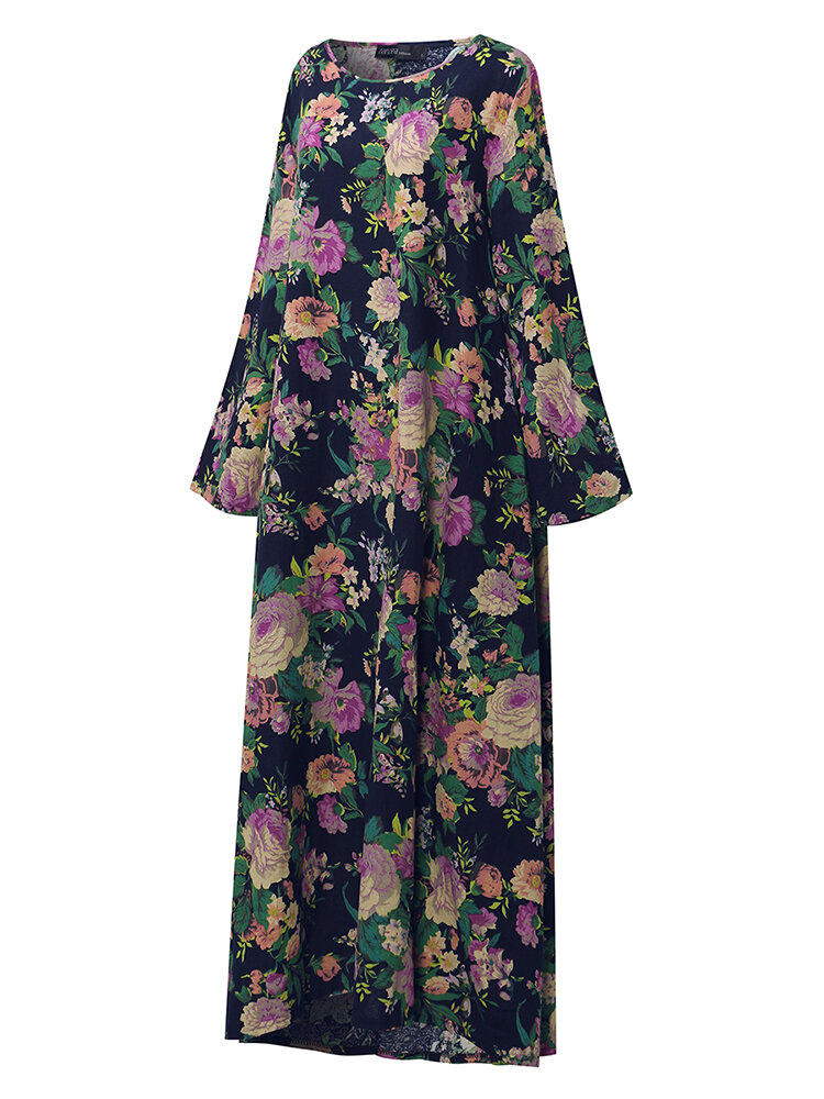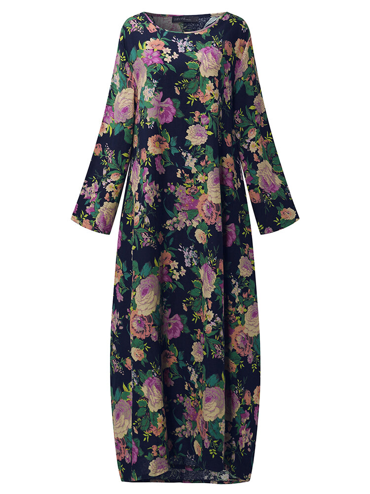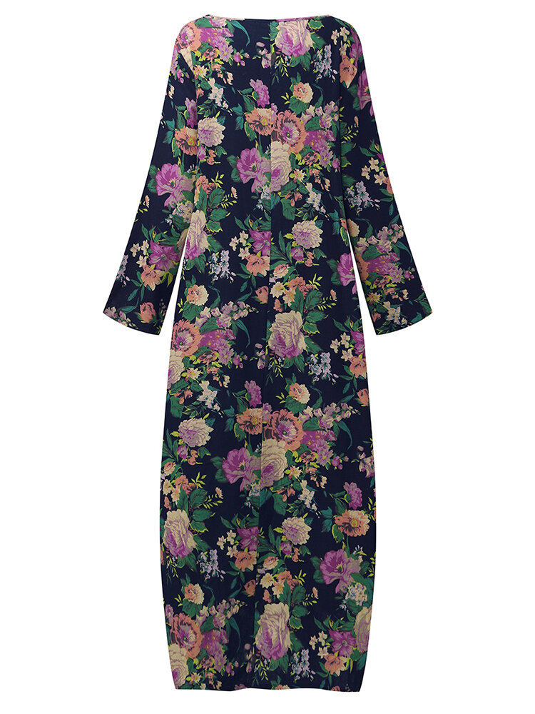 Mulheres retro floral impresso manga comprida o pescoço vestido de assoalho-comprimento COD