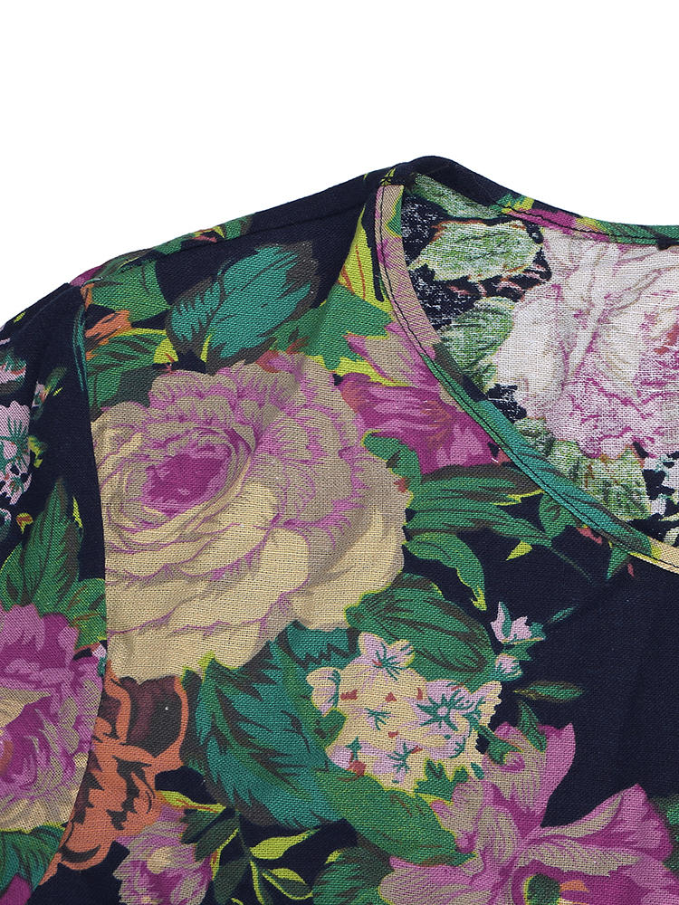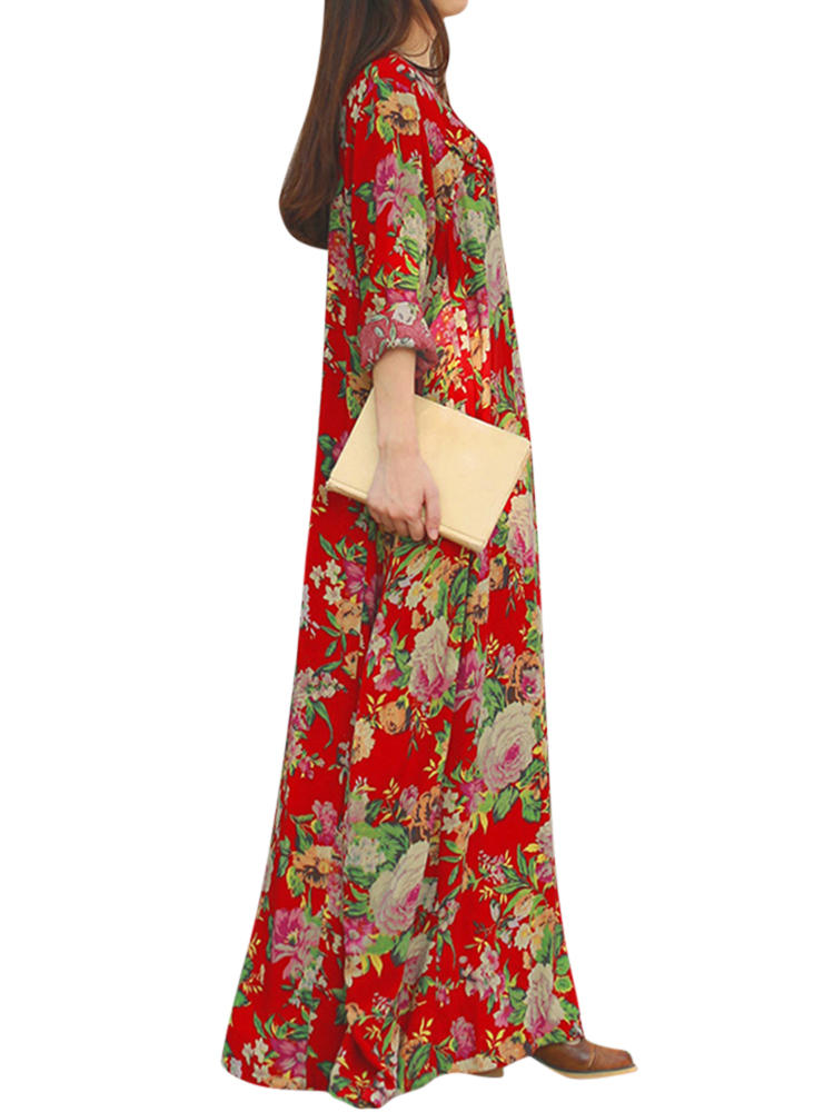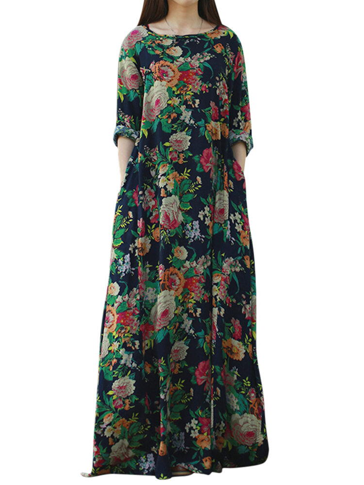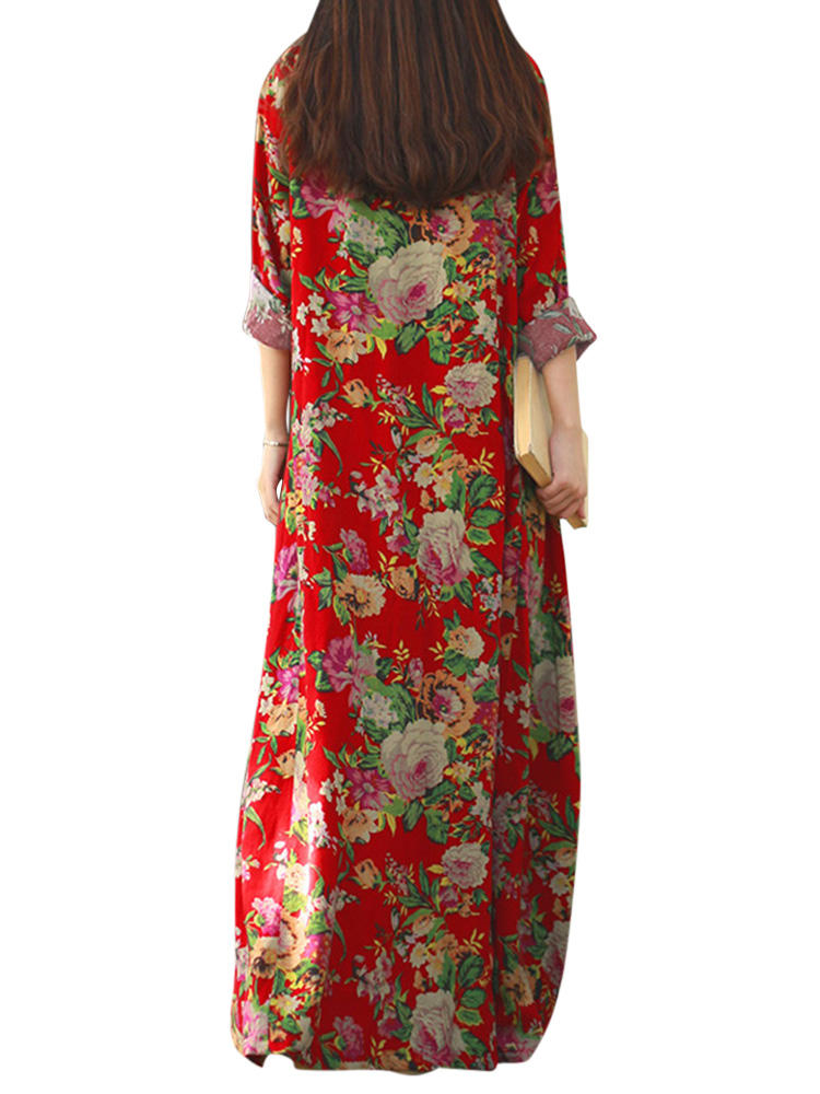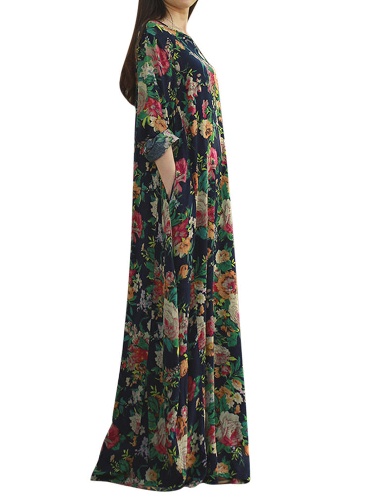 Mulheres retro floral impresso manga comprida o pescoço vestido de assoalho-comprimento COD