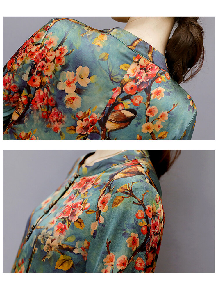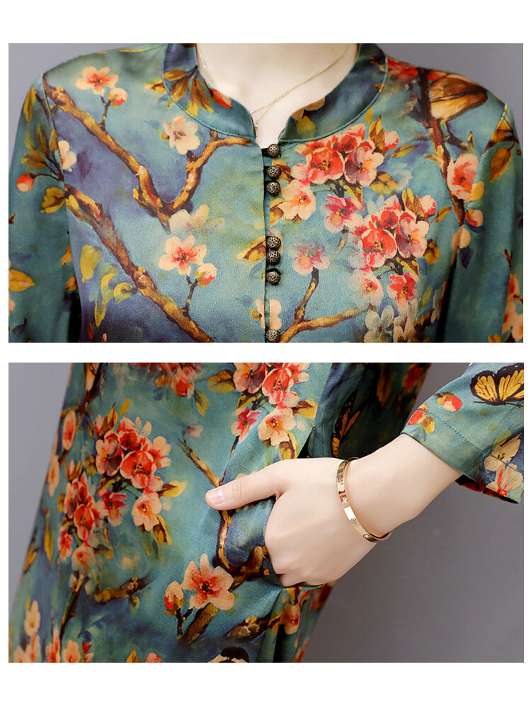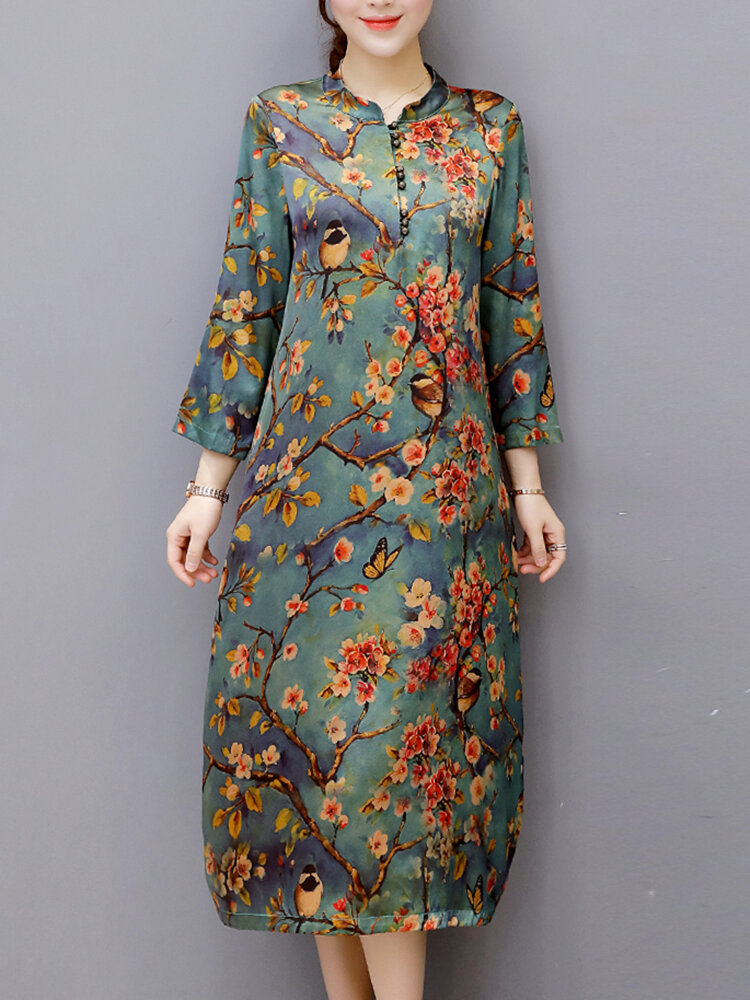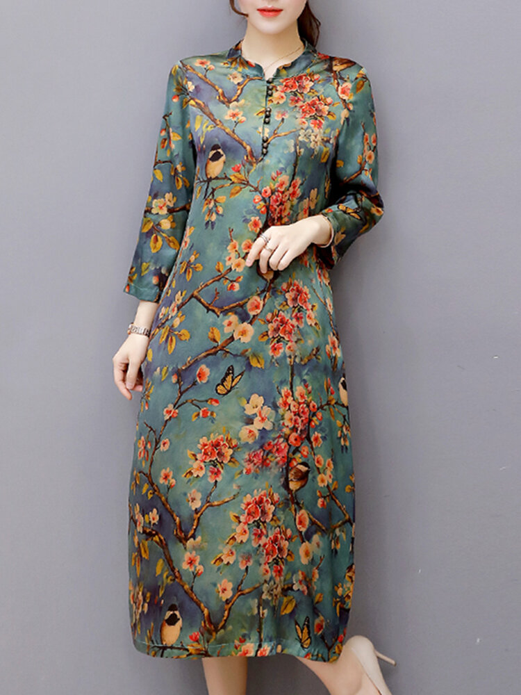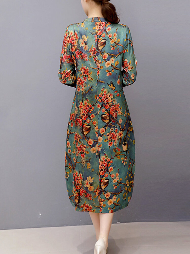 • Vintage Mulheres Floral Printed Long Sleeve Stand Collar Vestido Midi