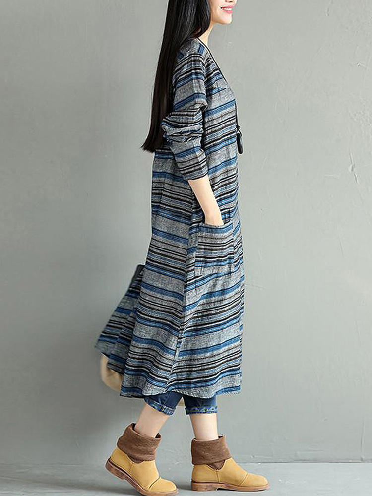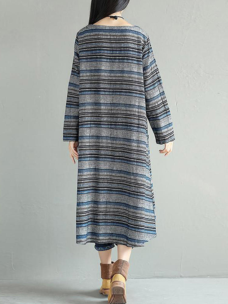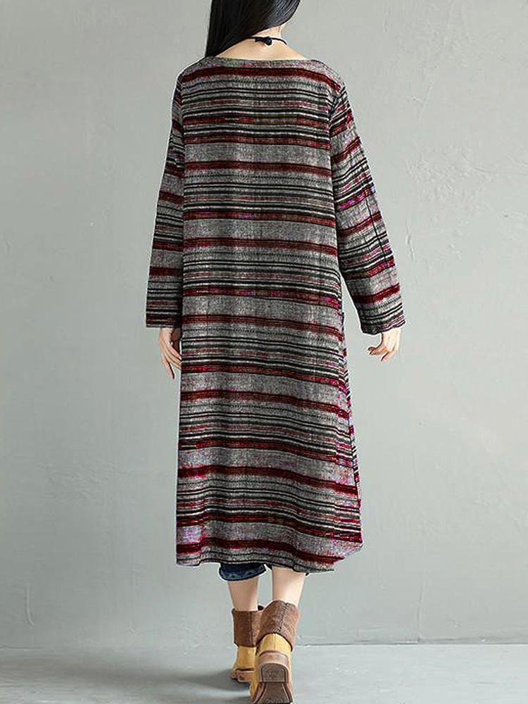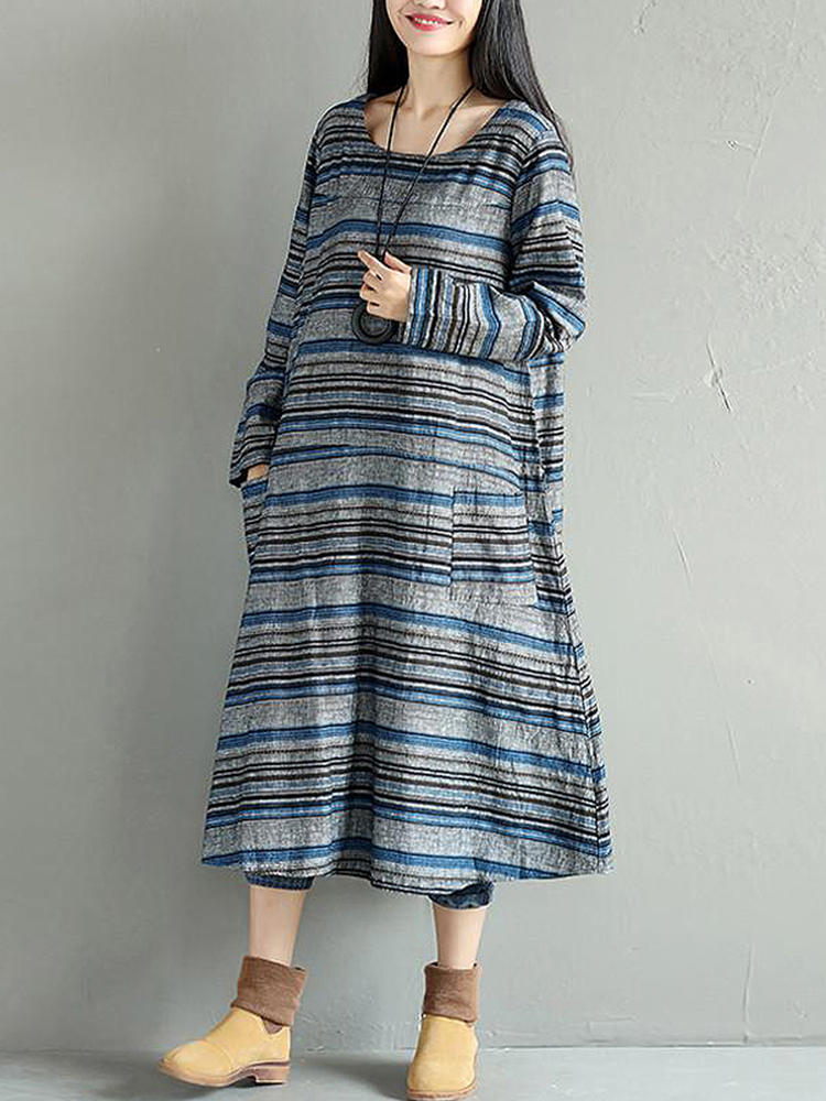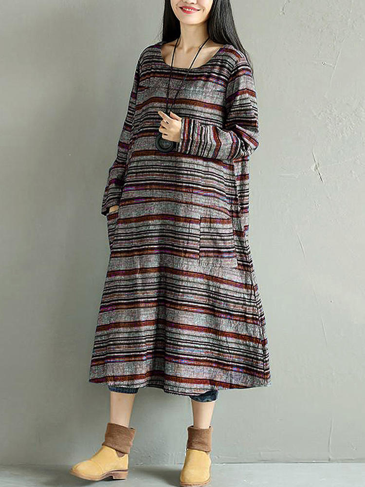 • Mulheres vintage luva longa listrada colher com pescoço vestido de medianoche com bolsos